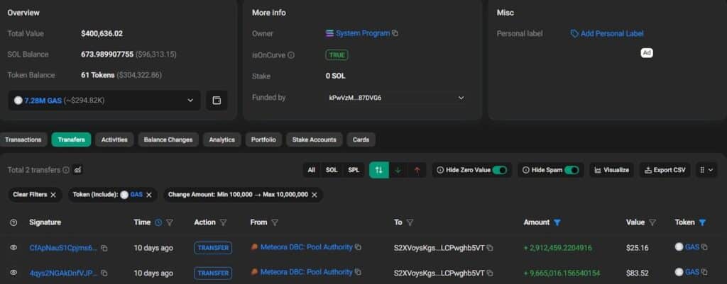 Dane on-chain z blockchaina Solana zdają się potwierdzać to wirusowe twierdzenie, ujawniając dwa kluczowe transfery na łączną kwotę około 12,5 miliona tokenów GAS (108 USD). Oba transfery pochodziły z autoryzowanego konta w puli Meteora i zostały wykonane w odstępie kilku minut, około 10 dni temu. Od tego czasu wartość aktywów spółki wzrosła do wartości przekraczającej 400 000 USD.