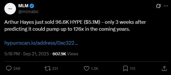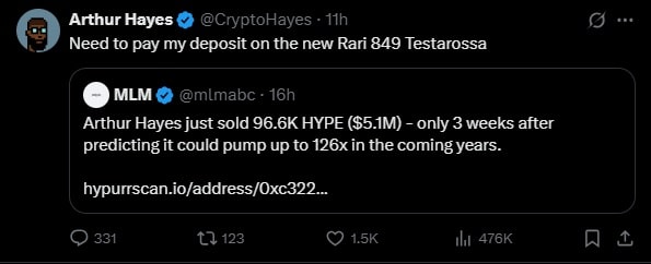 Przez długi czas Arthur Hayes był kojarzony głównie z Bitcoinem, któremu poświęcał najwięcej uwagi na swoich mediach społecznościowych. Sporadycznie w jego wpisach pojawiały się inne kryptowaluty. Jednak od kilku miesięcy dość często pisał o Hyperliquid. Nie był to posty nachalnie promujące token, ale subtelnie sugerował, że warto mieć tę kryptowalutę na oku.