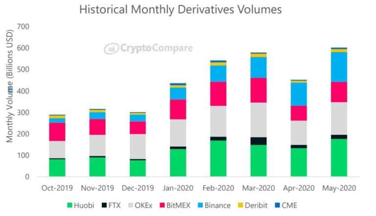 Według raportu CryptoCompare, miesięczny wolumen obrotu instrumentami pochodnymi kryptowalut wzrósł w maju o 30%. Osiągnął nowy rekordowy poziom 602 miliardów dolarów, bijąc poprzedni rekord z marca o niespełna 2 miliardy dolarów.