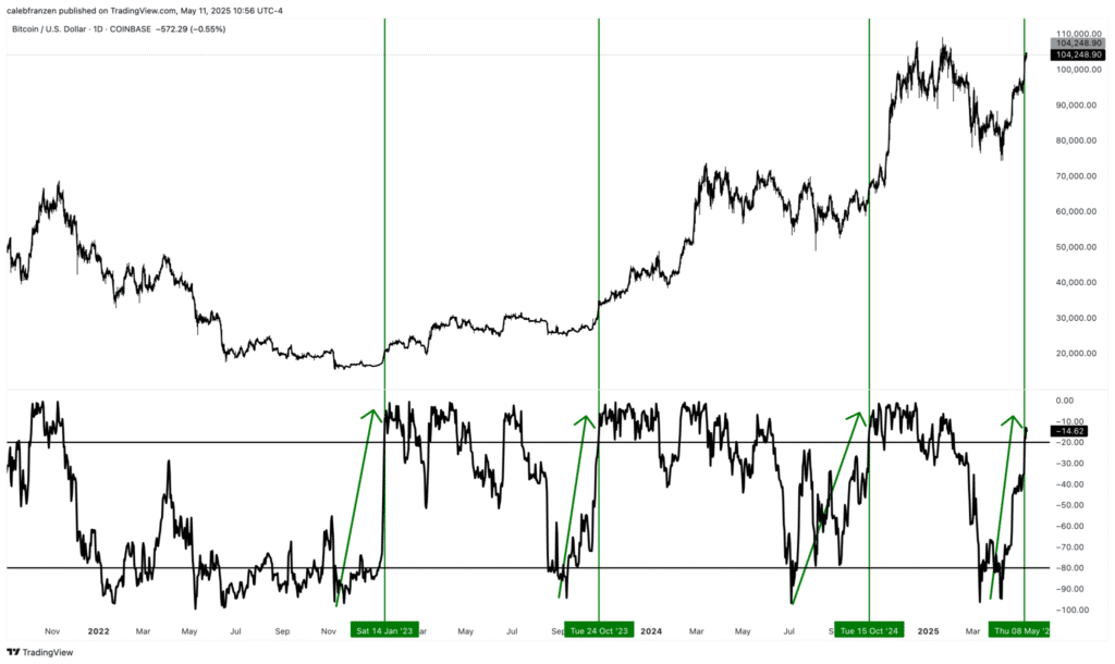 Wskaźnik Williams%R (120 dni) właśnie wygenerował sygnał kupna. W przeszłości było to rzadkie, lecz skuteczne zjawisko. W styczniu 2023 roku Bitcoin wzrósł o 49% w 90 dni, w październiku 2023 – o 42%, a w październiku 2024 aż o 61%.