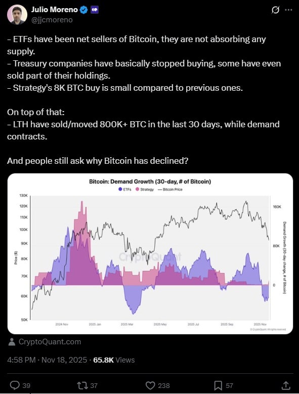 Jednak nie tylko BlackRock dawał sygnały, że coś jest nie tak. Julio Moreno z CryptoQuant zauważył, że już od pewnego czasu spółki takie jak MetaPlanet i Moreno się wycofują. Niektóre z tych firm ostatni raz kupiły BTC we wrześni, a część nawet zaczęła sprzedaż. W takich okolicznościach nawet zakupy MicroStrategy nie są w stanie zrównoważyć negatywnego trendu.