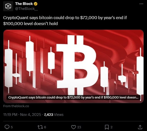 Julio Moreno, szef działu badań w CryptoQuant, w jednym z najnowszych wywiadów powiedział: „Jeśli cena nie utrzyma się na poziomie około 100 000 USD i przebije się w dół, istnieje większe ryzyko, że w ciągu jednego do dwóch miesięcy osiągnie poziom 72 000 USD”.