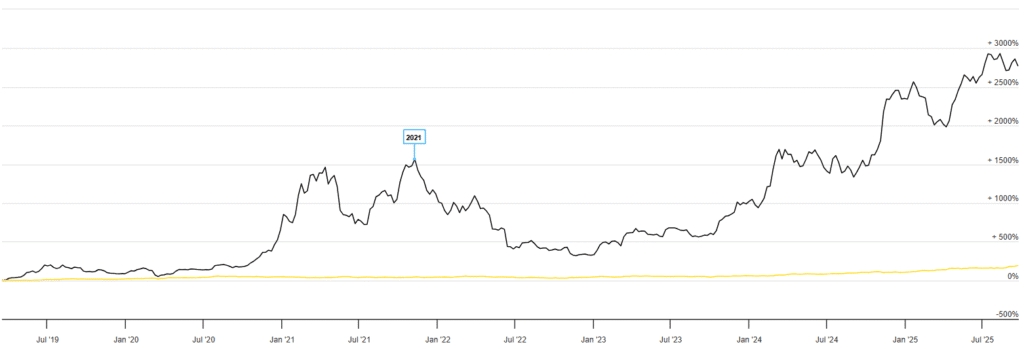 Na razie jednak to złoto ma swój moment. Jako tarcz Bitcoin jako eksperyment – tak widzi to wielu zarządzających. Ale kto pamięta o wzrostach długoterminowych, wie, że BTC rośnie w dekadę o średnio 85% rocznie. Złoto? Zaledwie 11%.
