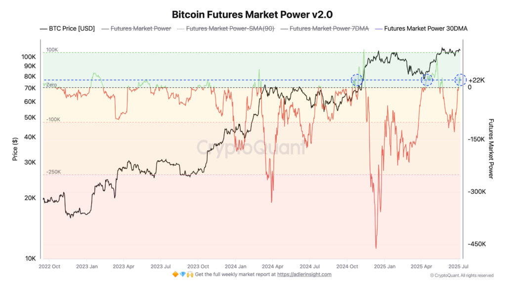Wskaźnik Bitcoin Futures Market Power v2.0 od analityka Axela Adlera Jr., łączący dane z OI, funding rates i poziomu akceptowalnego ryzyka kupujących – osiągnął poziom 22,000. Choć daleko mu do euforycznych szczytów z przeszłości (80,000+), to jednak po raz pierwszy od maja przyjmuje wartości dodatnie. Podobny poziom sygnalizował rynkowe dno w kwietniu. Dodatkowo, pozycjonowanie netto na rynku kontraktów terminowych przeszło w stronę długich pozycji, osiągając $27,4 mln netto.
