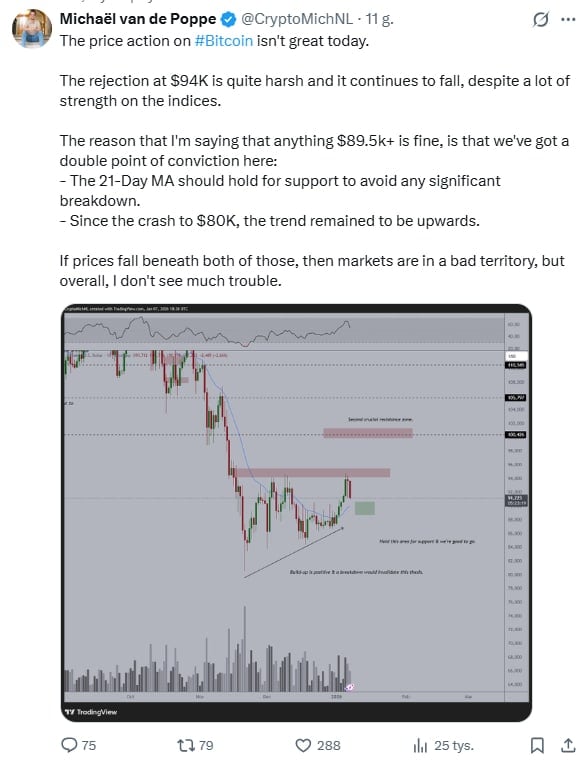 Na platformie X znany analityk rynkowy Miles Deutscher zauważył, że choć nastroje w styczniu bywają euforyczne, to rynek potrzebuje zdrowego oczyszczenia z nadmiernej dźwigni finansowej, zanim nastąpi atak na nowe szczyty. Podobnego zdania jest Michael van de Poppe, który w swoim najnowszym wpisie stwierdził, że konsolidacja Bitcoin w okolicach 90 000 USD jest naturalnym przystankiem po grudniowym ruchu bocznym i noworocznym wybiciu.