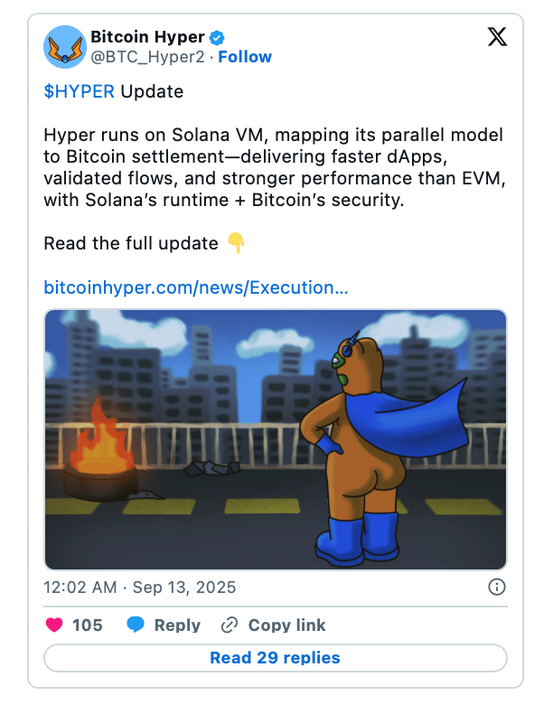 Zespół Bitcoin Hyper prowadzi regularną komunikację i publikuje raporty z badań nad warstwą wykonawczą. Integracja z SVM eliminuje ograniczenia modelu EVM i otwiera drogę do pełnej równoległości.