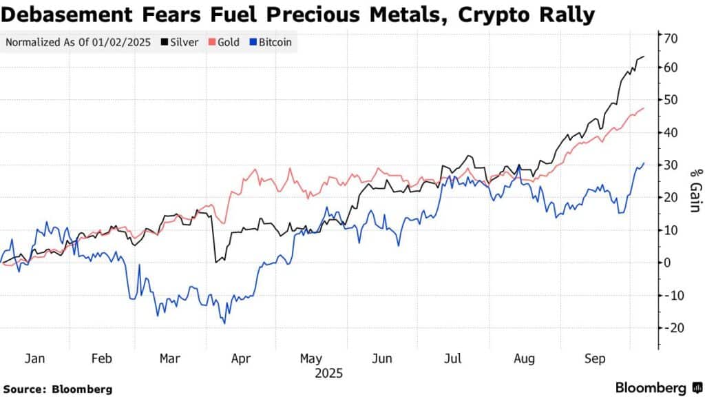 To, co obserwujemy, to klasyczny układ tzw. „debasement trade” – ucieczka od dewaluujących się walut w kierunku aktywów, których nie da się rozwodnić decyzją polityków. Złoto przebiło 3 900 dolarów za uncję, srebro balansuje tuż pod historycznym maksimum, a Bitcoin – mimo ogromnej zmienności – staje się coraz bardziej elementem portfela instytucjonalnego inwestora.
