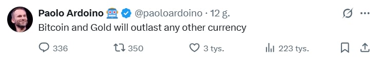 Paolo Ardoino, CEO firmy Tether, raz jeszcze wyraził swoje zdecydowane przekonanie, że Bitcoin i złoto są aktywami, które przetrwają każdą inną walutę.