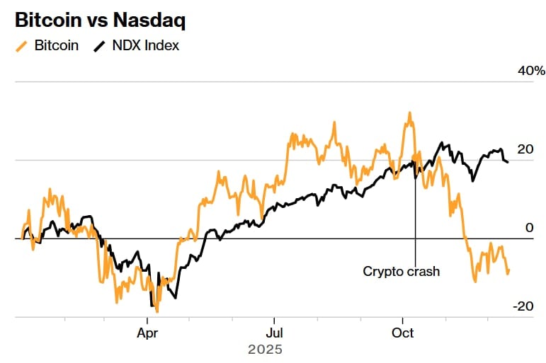 Od tego czasu rynek został oczyszczony z nadmiernego ryzyka, ale cena nie wróciła. Powód jest prosty. Po czyszczeniu dźwigni zabrakło nowego popytu spotowego. I to pomimo ewidentnego (choć ograniczonego) wzrostu indeksu Nasdaq 100 w drugiej połowie roku. A może zmęczenie wykracza poza Bitcoina i zadyszkę łapie też Wall Street?