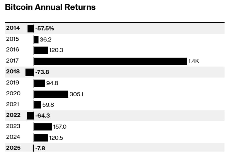 To ważna zmiana jakościowa. W poprzednich latach spadkowych rynek miał jasnego winnego. Na przykład w 2014 roku był to upadek Mt. Gox i 57,5% spadek. W 2018 roku pęknięcie bańki ICO zakończyło się historycznym spadkiem o 73,8%. W 2022 roku, po krachu FTX, Bitcoin stracił 64,3%. Rok 2025 wygląda inaczej. Nie ma jednego punktu zapalnego, ale jest zmęczenie.