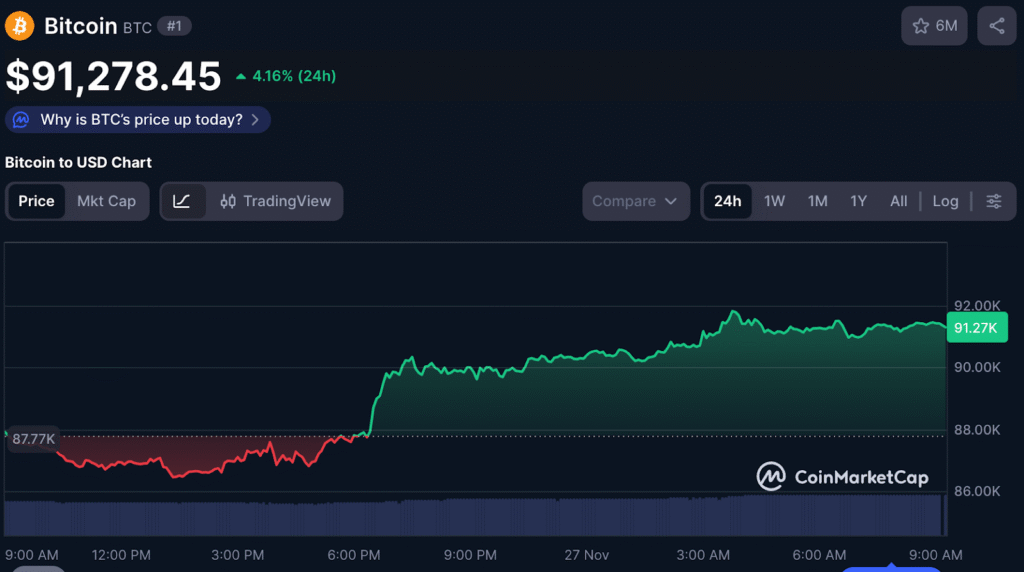 Bitcoin wraca do 91 500 dolarów po spadku do 80 600 dolarów w zeszłym tygodniu. Zwolennicy wskazują na więcej pieniędzy w obiegu, rosnące deficyty i luźniejsza polityka długoterminowa.