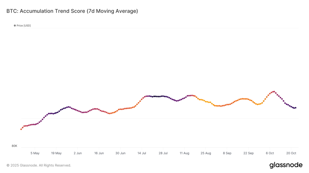 Według danych Glassnode, wskaźnik Bitcoin Accumulation Trend Score wynosi obecnie 0,924, co oznacza, że większe podmioty (tzw. wieloryby) i znacząca część sieci aktywnie gromadzą BTC.