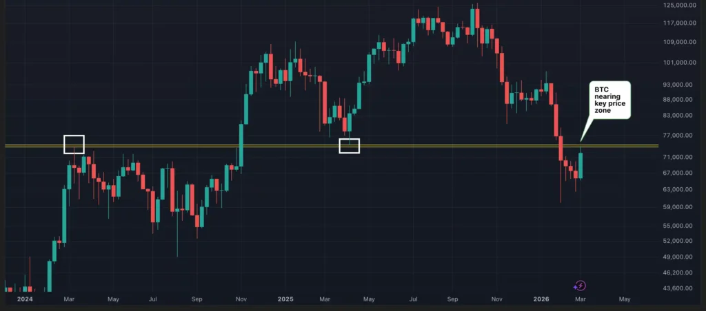 Analiza techniczna wskazuje, że obecnie obserwujemy próbę powrotu nad te poziomy po tym, jak na początku ubiegłego miesiąca cena osunęła się poniżej nich, wywołując panikę i spadek do poziomu 60 000 USD. Axel Rudolph zauważa, że zamknięcie sesji powyżej szczytu z marca 2024 roku na poziomie 73 757 USD jest niezbędne, aby w ogóle myśleć o powrocie do długoterminowych wzrostów (). Jeśli ten scenariusz się ziści, kolejnym celem dla rynku może stać się poziom 76 702 USD, który stanowi istotny punkt odniesienia z ubiegłego roku.