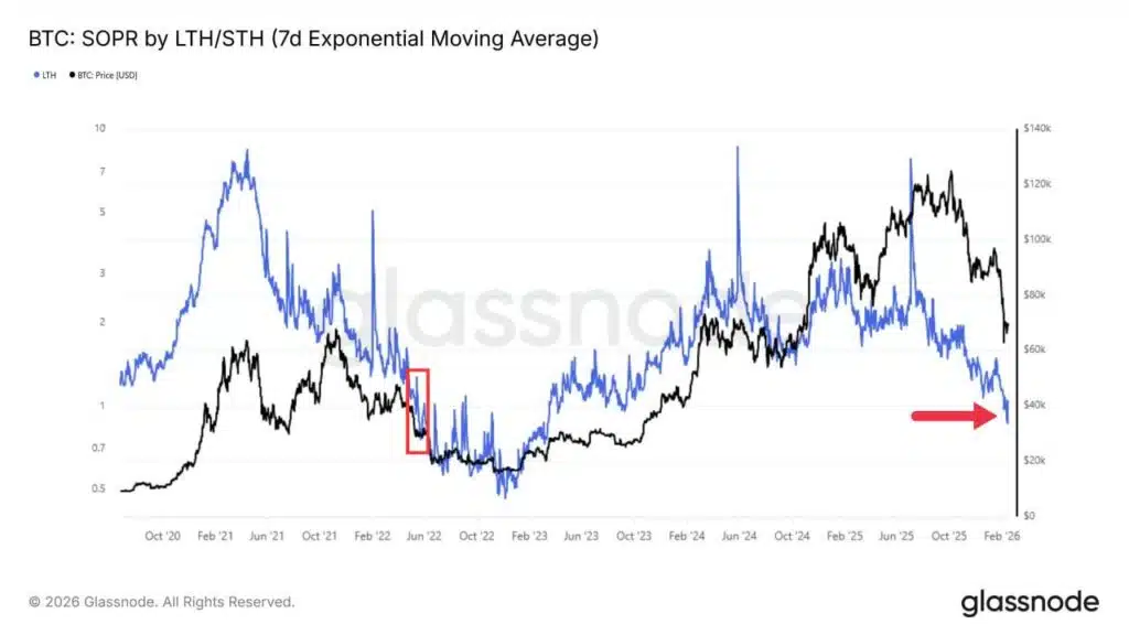 Obecnie aktywność zakupowa inwestorów długoterminowych jest tak słaba, jak miało to miejsce podczas tragicznego w skutkach krachu ekosystemu Terra-LUNA w 2022 roku. Wskaźnik SOPR dla posiadaczy długoterminowych spadł poniżej jedności po niemal dwóch latach utrzymywania się powyżej tego poziomu, co oznacza, że nawet rynkowi weterani zaczęli realizować straty na swoich pozycjach.