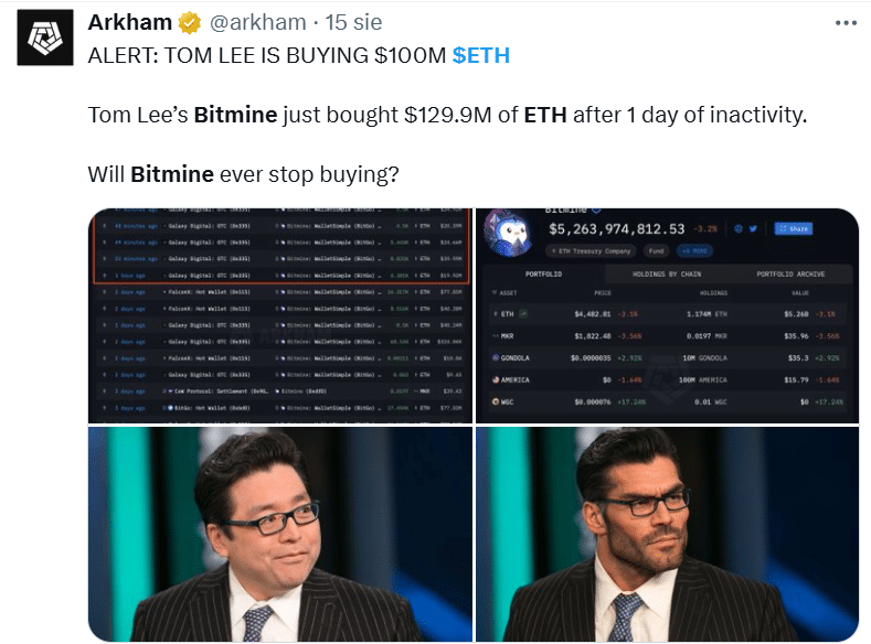 Dane Lookonchain ujawniły, że jeden z dużych graczy utworzył trzy nowe portfele. W ciągu zaledwie kilku dni wycofał z Kraken aż 92 899 ETH warte 412 mln dolarów. Dla analityków to jasny sygnał: nikt nie trzyma takich ilości w gorących portfelach, jeśli planuje szybki handel. To na pierwszy rzut oka czysta strategia długoterminowa. Podobnie zachował się doskonale znany wszystkim projekt World Liberty związany z Donaldem Trumpem. Firma kupiła prawie 2 tys. ETH za 8,6 mln USDC i dołożyła do tego 84,5 BTC w formie Wrapped Bitcoin za 10 mln dolarów. To jednak tylko przystawka przy tym, co zrobił BitMine.
