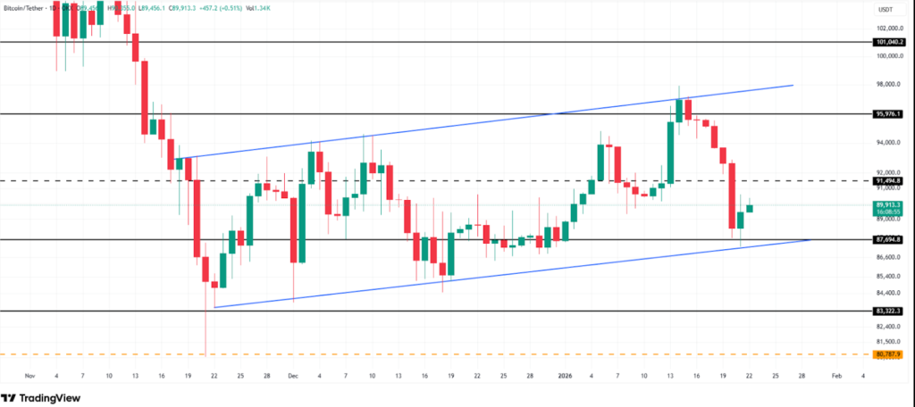 Z technicznego punktu widzenia, Bitcoin zmienia właściciela w kanale wzrostowym od połowy listopada 2025 roku. Ten wzór zazwyczaj sygnalizuje kontynuację wyraźnego trendu. Ostatnio BTC ledwo uniknął całkowitego przebicia dolnej linii trendu. Dlatego, że krótkoterminowi nabywcy aktywnie wkroczyli na rynek.