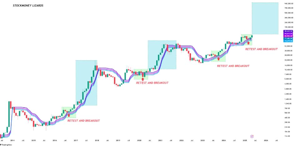 Jak wynika z analizy opublikowanej przez konto Stockmoney Lizards na platformie X Bitcoin właśnie opuścił pasma OTT na wykresie miesięcznym – co historycznie oznaczało początek dynamicznego wzrostu. Wyjaśnijmy, że narzędzie to wykorzystuje średnie kroczące oraz wskaźnik średniego rzeczywistego zakresu (ATR), co czyni je jednym z najbardziej wiarygodnych wskaźników długoterminowych trendów. Poprzednie takie sygnały miały miejsce przed znacznymi wzrostami cen w latach 2016 i 2020.