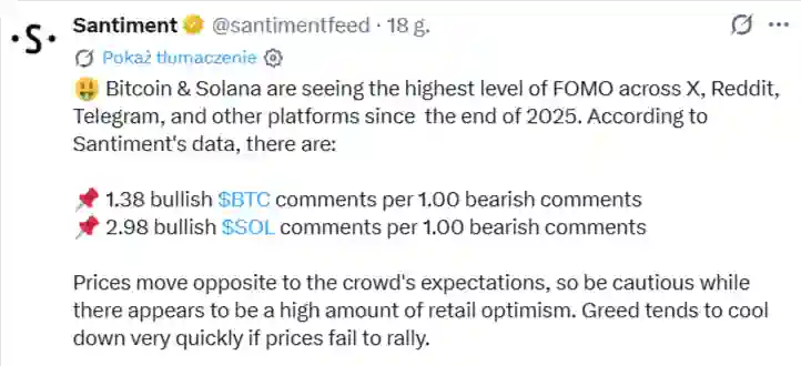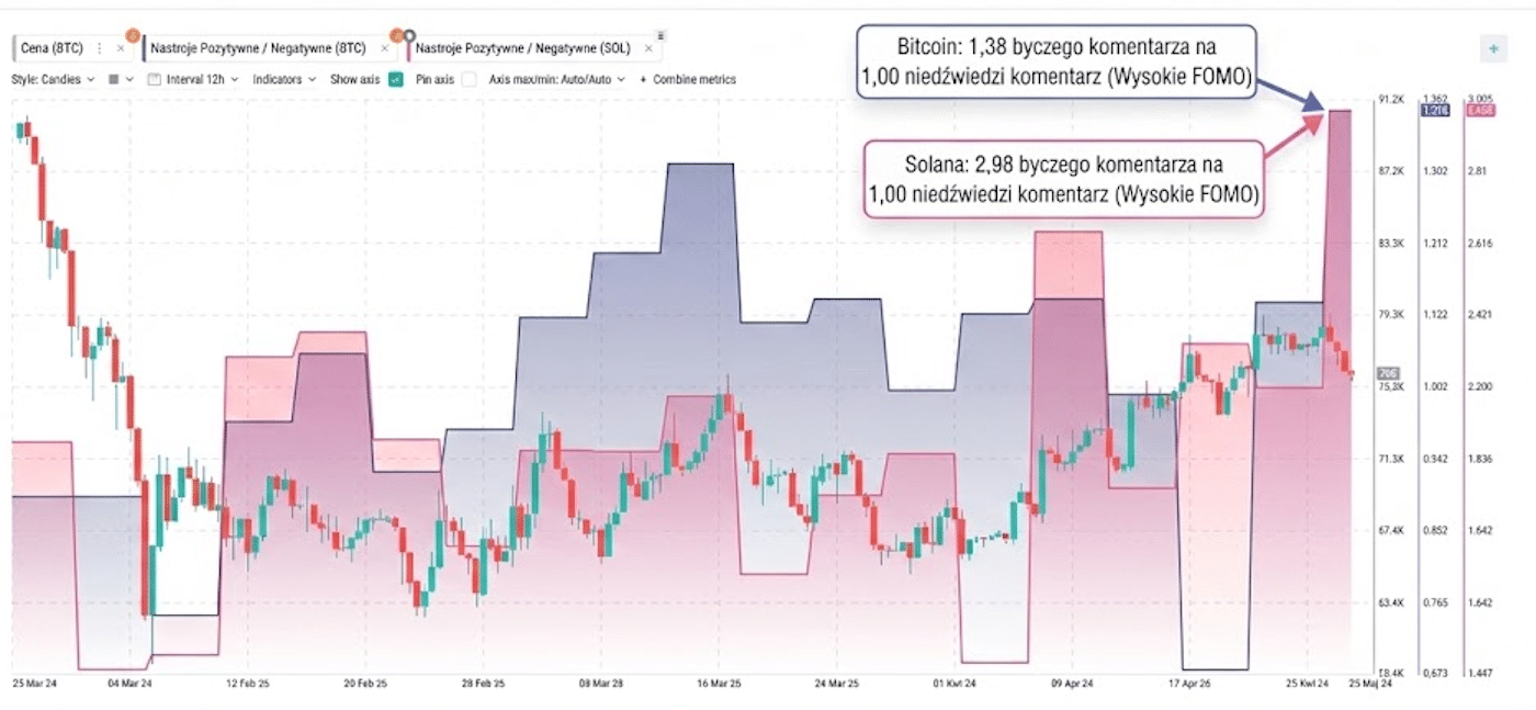 Analitycy z firmy Santiment poddali analizie tysiące wpisów w serwisach takich jak X, Reddit oraz Telegram, z których wynika, że optymizm tłumu osiągnął poziomy ekstremalne. Warto zauważyć, że wszelkie głosy sugerujące powrót kursu do przedziału 50 000 – 59 000 USD są obecnie przez użytkowników masowo wyśmiewane i określane mianem szerzenia strachu oraz niepewności. Entuzjazm ten jest napędzany przekonaniem, że powolne odbicie od lutowego dołka w okolicach 60 000 USD nabierze tempa wraz z nadejściem maja.