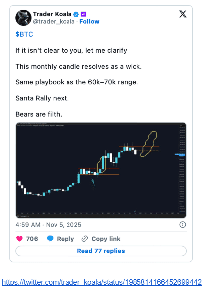 Niektórzy analitycy – jak Trader Koala – zauważają jednak, że obecne ruchy przypominają konsolidację z lat 2023–2024, która poprzedzała silne wybicie. Jeśli historia się powtórzy, rynek może zobaczyć nowy impuls wzrostowy w grudniu, z potencjalnym celem w okolicach 135 000–145 000 USD.