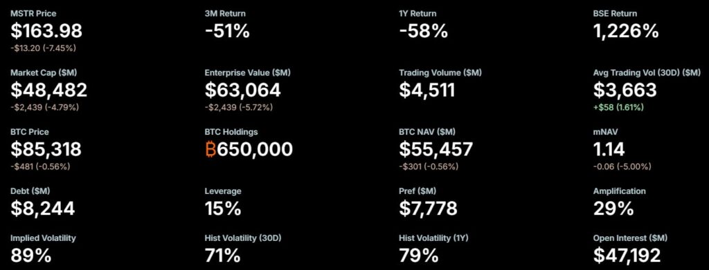 Łącznie, holding BTC skorygowany o dług, ale uzupełniony gotówką to 48,4 mld USD, przy kapitalizacji 45 mld USD. Oznacza to, że rynek wycenia potężne ryzyko płynności i być może dyskontuje tym informacje, które dopiero trafią na rynek. Same BTC warte są obecnie prawie 3,5 mld USD więcej, niż kapitalizacja spółki.