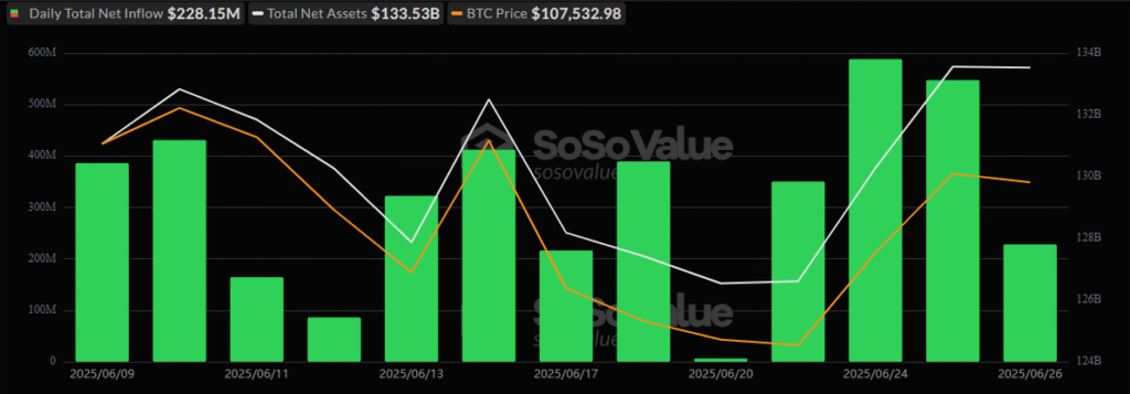 Rynek spot ETF-ów na Bitcoina w USA kontynuuje swoją imponującą serię – już 13 ty dzień z rzędu odnotowuje dodatnie saldo napływów. Łączna kwota wpływu kapitału z dzisiaj wyniosła 228,15 mln USD, a liderem po raz kolejny był fundusz IBIT od BlackRock, który przyciągnął aż 163,72 mln USD!