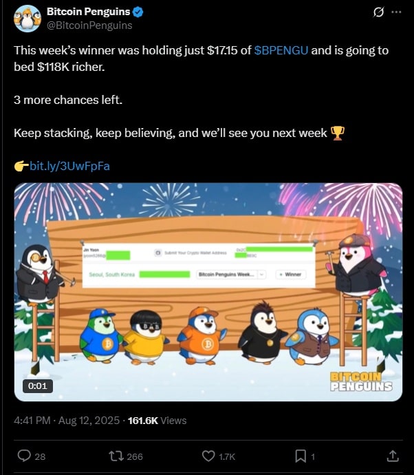 Przedsprzedaż kończy się 27 sierpnia, a notowania startują 2 września. Bitcoin Penguins daje inwestorom szansę na wczesne wejście w jednego z najmocniejszych memecoinów 2025 roku. Pudgy Penguins pokazały, że ta formuła działa, a Bitcoin Penguins są przekonane, że uda się to powtórzyć.