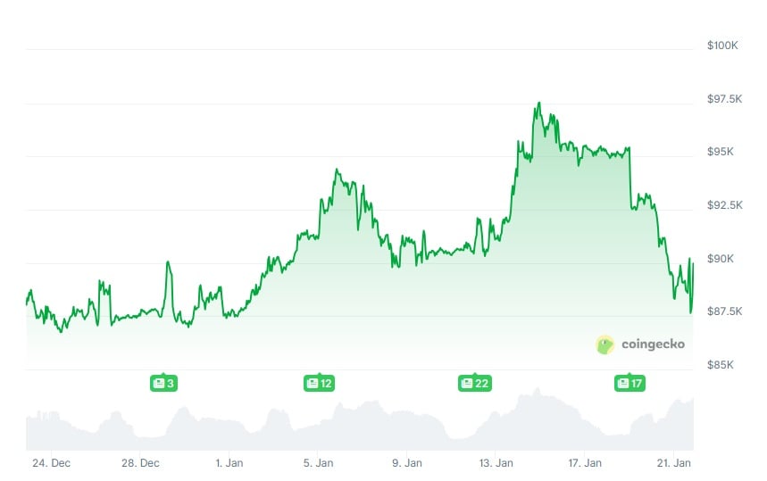 Po jego słowach Bitcoin (BTC) zanotował wzrost o 1,7%, odzyskując poziomy w pobliżu 90 000 USD i w chwili pisania artykułu: stale je utrzymuje. To bardzo dobry zwiastun.