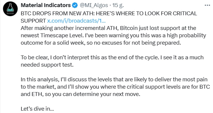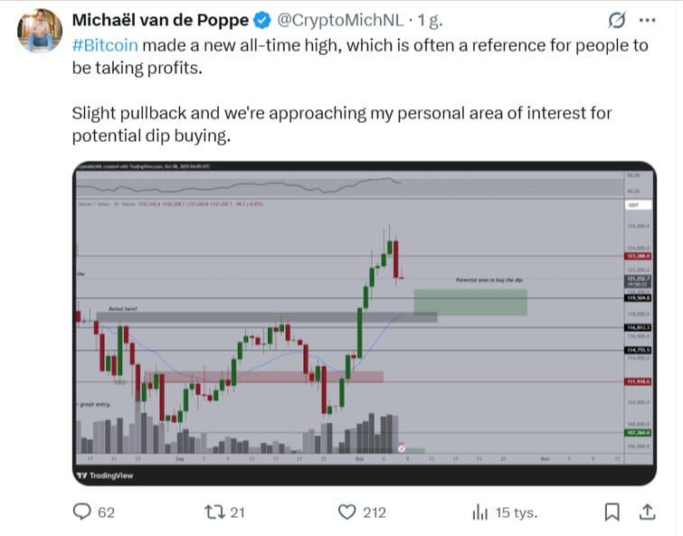 Dla Michaëla van de Poppe, znanego tradera i analityka, strefa ponownego zakupu rozciąga się do 118 000 USD. Jak sam przyznaje, osiągnięcie nowego rekordu wszechczasów często jest punktem odniesienia, w którym inwestorzy masowo realizują zyski, co tłumaczy obecne cofnięcie.