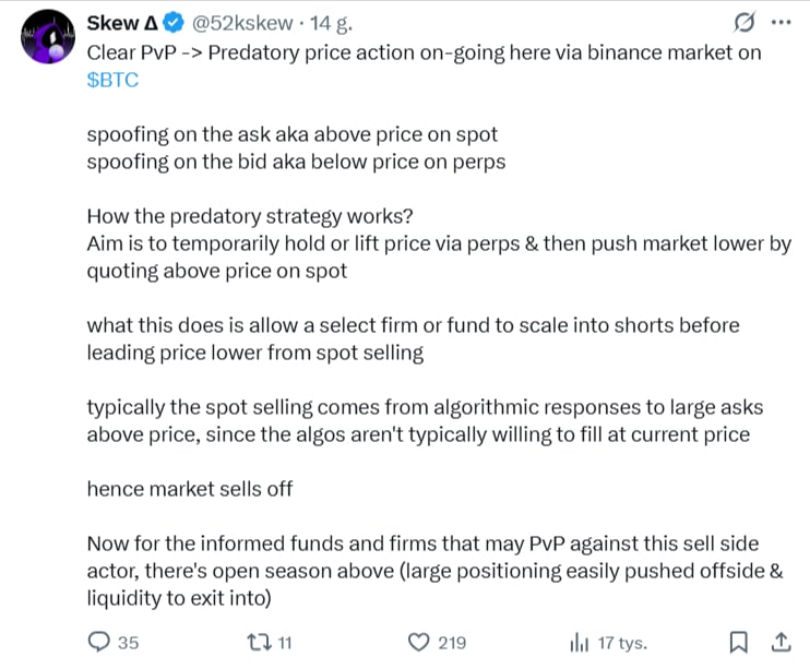 Skew zauważył także „drapieżne” zachowanie ze strony dużych graczy na giełdowych księgach zleceń.