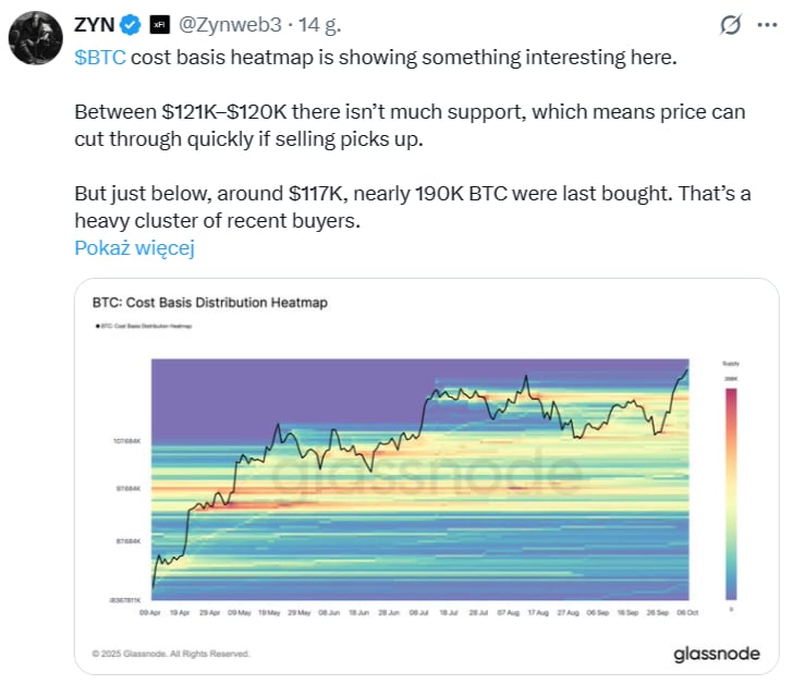 Analitycy techniczni i on-chain skupiają się teraz na znalezieniu wiarygodnego lokalnego wsparcia dla BTC. Trader ZYN na platformie X zwrócił uwagę, że w strefie od 121 000 USD do 120 000 USD brakuje silnego wsparcia, co czyni rynek podatnym na szybkie spadki w przypadku nasilenia się presji sprzedażowej.