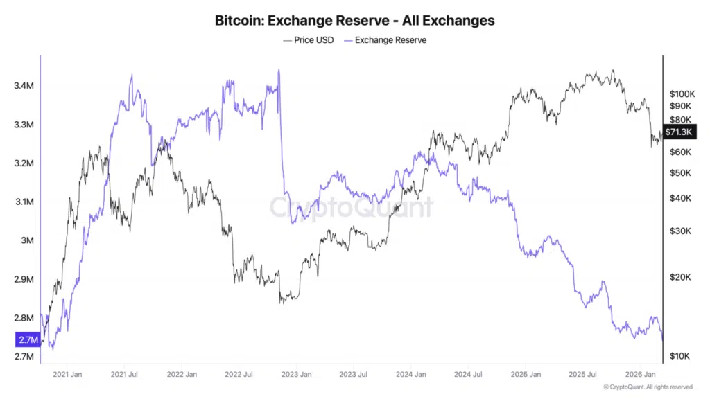 Dane on-chain pokazują wyraźną zmianę w strukturze rynku kryptowalut. Rezerwy Bitcoina na giełdach spadły do około 2,7 miliona BTC, co stanowi najniższy poziom od końca 2020 roku. Informacje pochodzą z analiz firmy CryptoQuant. Oznacza to, że coraz mniej monet pozostaje dostępnych do natychmiastowej sprzedaży.