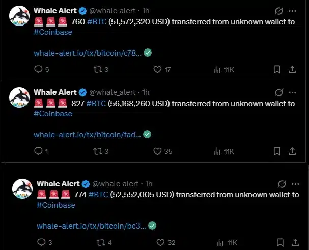 Jednak ruch w sieci pokazuje, że sytuację trzeba śledzić na bieżąco. Dane z Whale Alert pokazują, że wciąż są wieloryby, które pozbywają się swoich BTC. Tylko w ciągu jednej godziny platforma zaobserwowała trzy duże transfery na Coinbase. To zwykle sygnał, że Bitcoin trafi na sprzedaż.