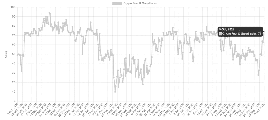Pomimo rosnących zysków rynek zachowuje się relatywnie spokojnie. Indeks Fear & Greed pokazuje poziom 74 punktów, czyli strefę „chciwości”, ale wciąż daleko od euforii znanej z listopada ubiegłego roku. Wówczas indeks sięgał 94.