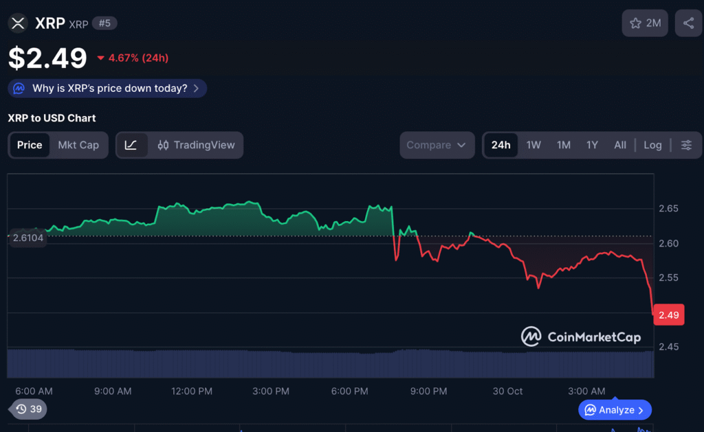 Wraz ze spadkiem wartości Bitcoina, XRP spadł o 4,66% do 2,49 USD z 2,66 USD dzień wcześniej. Ethereum i Solana również odnotowały czerwone świece. Wielu inwestorów najwyraźniej zdecydowało się na ograniczenie ekspozycji w obliczu niepewności co do dalszych obniżek stóp procentowych.