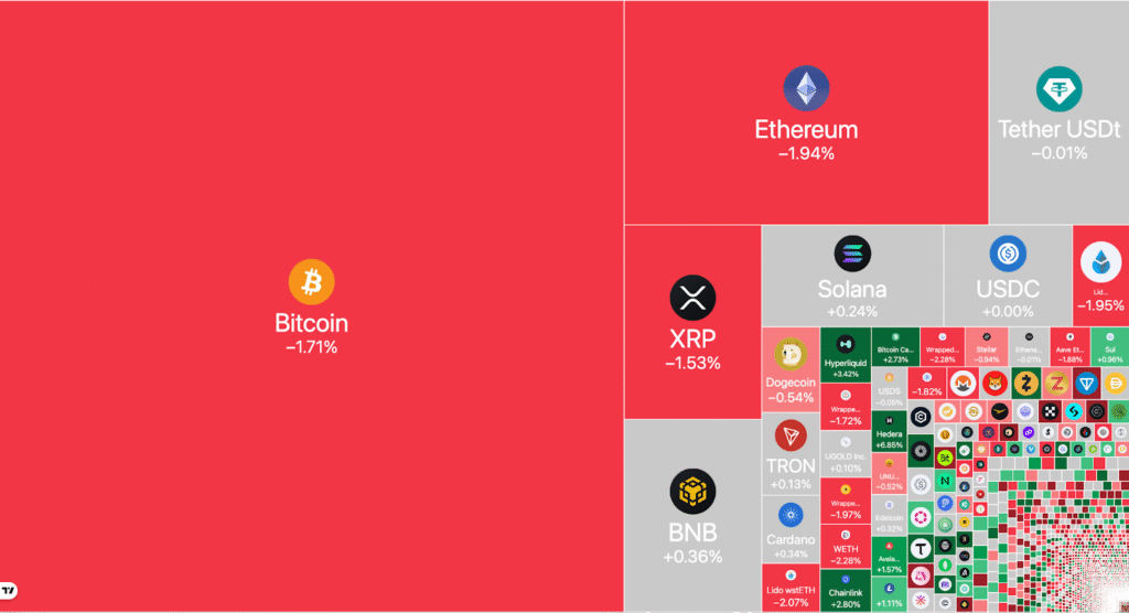 Pomimo rzekomo byczej sytuacji, rynki kryptowalut zareagowały negatywnie. Bitcoin spadł o 4,12% do 108 070 dolarów. Wycofał swój tygodniowy wzrost po osiągnięciu w poniedziałek poziomu powyżej 116 400 dolarów.