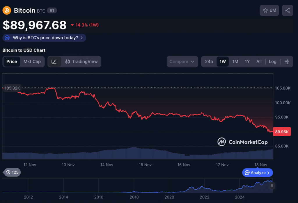W tej chwili Bitcoin kosztuje około 89 960 dolarów. Spadł o 14% w ciągu jednego tygodnia i obecnie znajduje się 29% poniżej historycznego maksimum 126 200 dolarów. Podczas gdy Bitcoin traci na wartości, jeden wschodzący altcoin całkowicie przeciwstawia się spadkom.