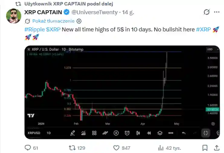 Obecnie uwaga traderów skupiona jest przede wszystkim na oporze na poziomie 1,44 USD oraz wsparciu w okolicach 1,40 USD, ponieważ XRP testuje kluczową strefę strukturalną. Notowania utrzymują się powyżej 200-dniowej średniej kroczącej wykładniczej (EMA), jednak zmienność wolumenu handlowego pozostaje zbyt niespójna, aby jednoznacznie potwierdzić trwałe i decydujące wybicie. Eksperci rynkowi dostrzegają w relatywnej sile tej kryptowaluty wczesne sygnały rotacji kapitału oraz potencjał wynikający z wieloletniego układu technicznego, który może zwiastować zakończenie szerokiej fazy konsolidacji. Wielu obserwatorów uważa, że obecna konfiguracja jest częścią struktury, która mogłaby wynieść kurs w stronę znacznie wyższych poziomów, a optymiści wskazują nawet na długoterminowe cele sięgające 10 USD. Według popularnego analityka XRP Captain, obecne ruchy mogą być powtórzeniem historycznego fraktala, który sugeruje, że wybicie nastąpi lada moment, a cena przed końcem maja może realnie aspirować do poziomu 40 USD.