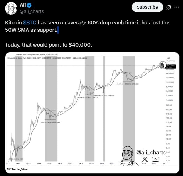 Martinez zauważył, że za każdym razem gdy Bitcoin tracił wsparcie w postaci 50W SMA, notował średnio 60% spadek. To oznacza, że jeśli scenariusz się powtórzy, to cena największej kryptowalut zaliczy krach, który spowoduje zjazd nawet do 40 tys. dolarów za monetę.