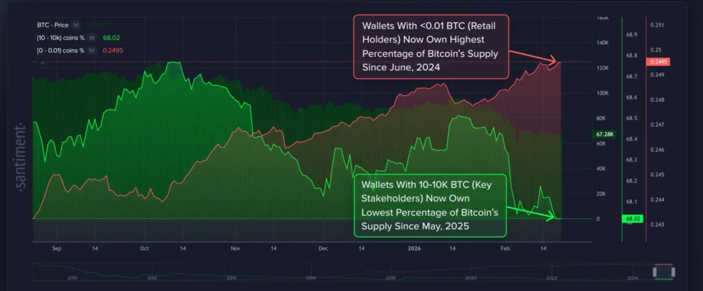 Eksperci rynkowi zauważają, że sytuacja ta jest o tyle ciekawa, iż jeszcze kilka tygodni temu sygnały płynące z sieci były znacznie bardziej spójne. Po gwałtownym spadku kursu w stronę 60 000 USD na początku lutego wskaźnik Accumulation Trend Score od Glassnode wzrósł do poziomu 0,68 co było najwyższym odczytem od listopada. Sugerowało to, że rynek przechodzi z fazy kapitulacji do fazy szerokiej akumulacji obejmującej różne wielkości portfeli. Szczególnie agresywne w kupowaniu dołków wydawały się podmioty dysponujące kapitałem rzędu od 10 do 100 Bitcoin. Jednak szersze spojrzenie oferowane przez Santiment studzi ten entuzjazm pokazując, że w skali całego pasma posiadaczy dużych portfeli bilans netto od października pozostaje ujemny. Można to interpretować w taki sposób, że podczas gdy średniej wielkości gracze rzeczywiście kupowali w panice to ci najwięksi wciąż wykorzystują każde odbicie do wyjścia z rynku. Taka dynamika sprawia, że każda próba wyjścia powyżej oporów jest natychmiastowo tłumiona przez podaż płynącą z najgrubszych portfeli.