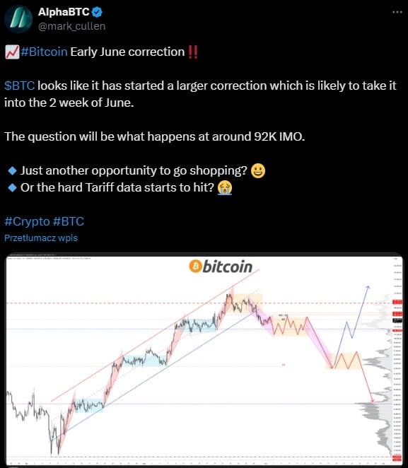 Kluczowe pytanie, które zadają sobie traderzy jest następujące – Co stanie się z Bitcoinem, jak zanurkuje w okolice 92K?. To właśnie ten poziom może zdecydować o losach trendu. Albo zobaczymy odbicie w kierunku nowego ATH, albo zaliczymy srogą korektę, która znowu zmiecie z planszy graczy, którzy źle obstawili. Na ten moment poziomy psychologiczne 100K i 97K pozostają w centrum uwagi. W momencie wzrastającej niepewności makro, czerwiec zapowiada się jako kluczowy miesiąc dla średnioterminowego trendu BTC, a co za tym idzie – dla całej branży krypto.