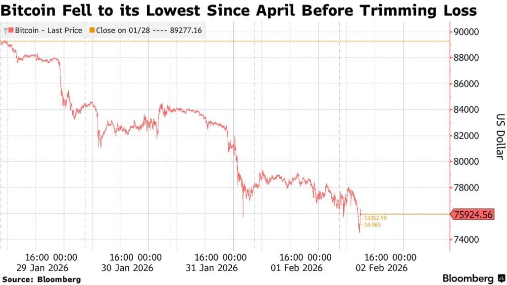 Sean McNulty z FalconX podkreśla, że rynek opcji pokazuje pierwsze oznaki stabilizacji po skrajnej awersji do ryzyka… Jednak ostrzega, że tygodniowe zamknięcie poniżej 75 tys. USD unieważniłoby obecne odbicie i mogłoby otworzyć drogę do ruchu w stronę 69–70 tys. USD.