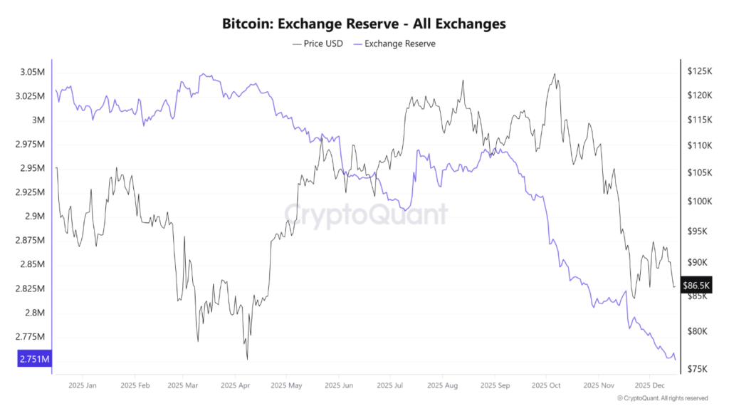 Dane CryptoQuant potwierdzają dalszy odpływ BTC z giełd. Na koniec 2025 roku na platformach handlowych pozostało około 2,75 miliona Bitcoinów. To najniższy poziom w historii.