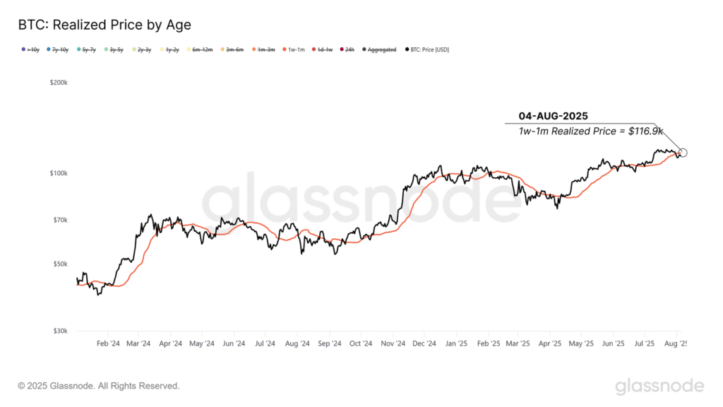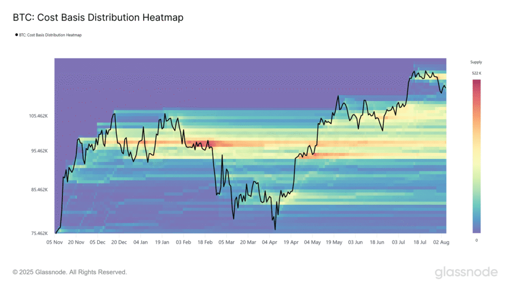 Po ustanowieniu nowego rekordu wszech czasów na poziomie 123 tys. USD w połowie lipca, kurs BTC cofnął się do ok. 113 tys. USD, wpędzając inwestorów w straty. W efekcie powstała szeroka strefa podaży z bazowym kosztem powyżej 116 tys. USD. Dolna granica tej strefy była wielokrotnie testowana, a każdy taki test kończył się odbiciem i utrzymaniem wsparcia. 31 lipca bariera ta została zdecydowanie przełamana. To otworzyło drogę do wspomnianej „luki” opisywanej już wcześniej przez Glassnode’a.