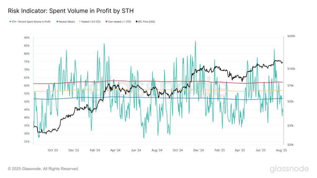 Aby ocenić, jak obecne cofnięcie wpłynęło na zachowanie inwestorów, Glassnode przyjrzał się procentowi wolumenu sprzedanych Bitcoinów, które pochodzą od krótkoterminowych posiadaczy będących w zysku. Taki wskaźnik bezpośrednio mierzy, ile z niedawno nabytych BTC jest realizowanych z zyskiem. Odsetek BTC sprzedawanych przez STH z zyskiem wyraźnie się ochłodził i wynosi obecnie 45%. To jest poziomem poniżej neutralnego progu. Ogólnie sugeruje to, że rynek znajduje się w dość zrównoważonej sytuacji. Aż 70% podaży STH wciąż jest w zysku, a ilość BTC sprzedawanych z zyskiem i ze stratą jest niemal wyrównana.