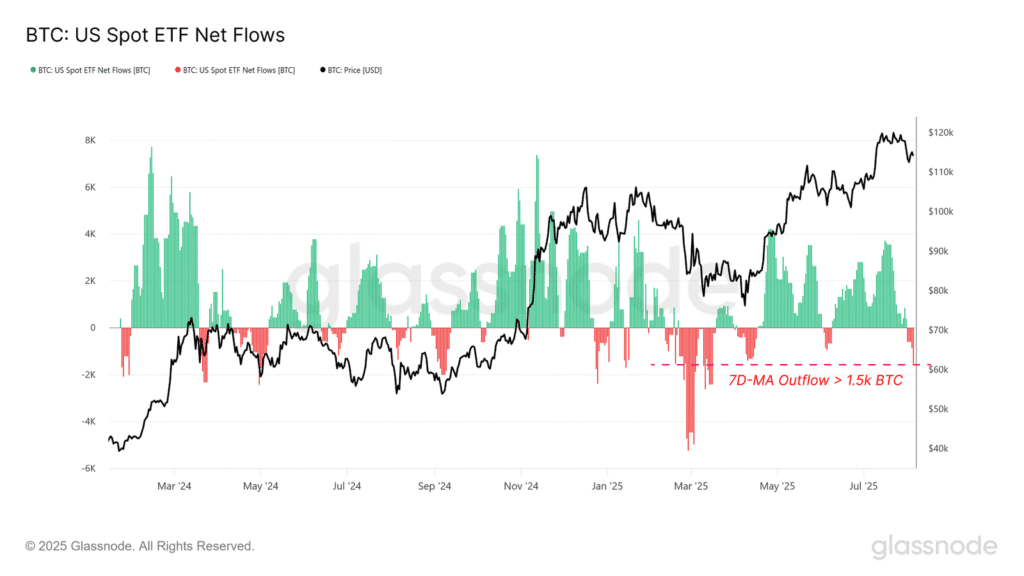 Aby wzmocnić tę analizę on-chain, Glassnode spojrzał na te dane w kontekście popytu ze strony tradycyjnych instrumentów, jakimi są ETF-y. Dokładnie 5 sierpnia z ETF-ów nastąpił stosunkowo duży odpływ środków w wysokości -1,5 tys. BTC. Było to największą falą presji sprzedażowej od kwietnia 2025 roku.