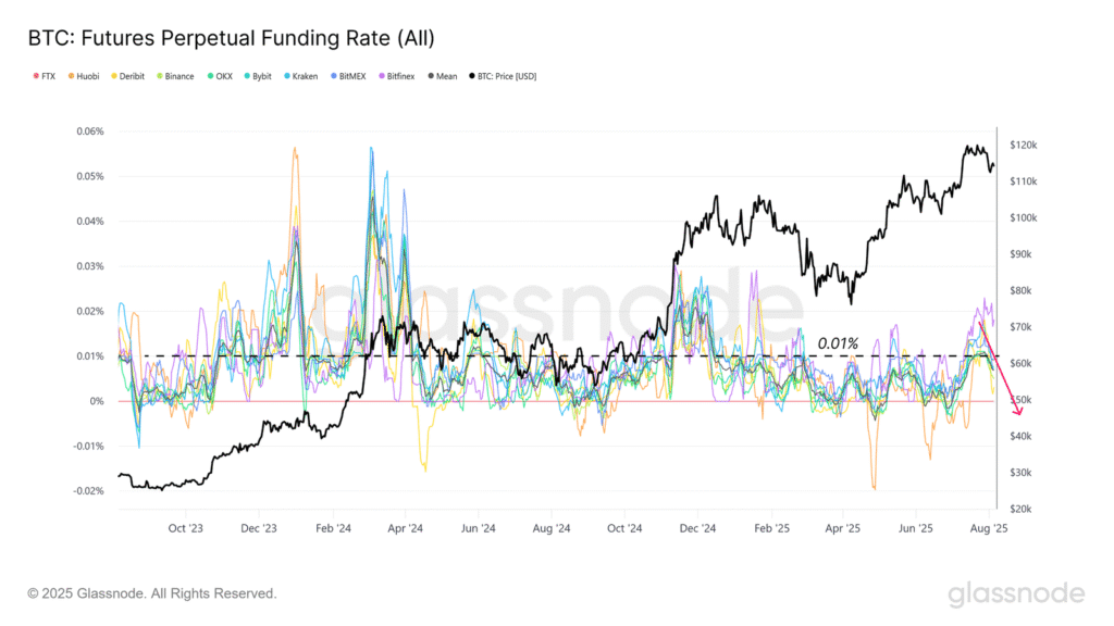 Patrząc poza rynek spot, nastroje na rynku kontraktów wieczystych również oddaliły się od krótkotrwałego poziomu euforii. Zarówno skumulowane, jak i pojedyncze stopy finansowania na wszystkich rynkach swap dla BTC spadły ze szczytów i oscylowały poniżej 0,1%. Taki zakres jest często uznawany za neutralny, wskazując na brak chęci byków do płacenia wysokich premii za dźwignię na pozycjach długich. To sygnalizuje zmniejszenie przekonania o szybkim wzroście ceny.