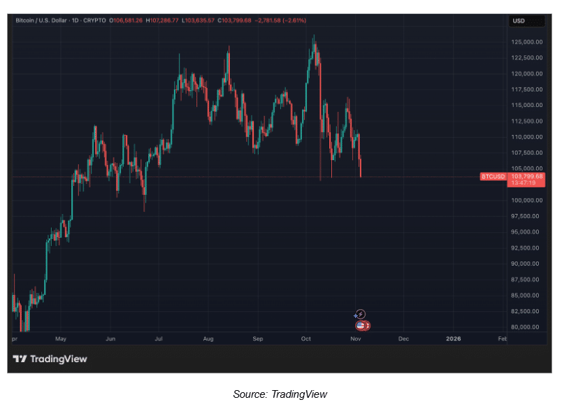 Ostatnie dni przyniosły znaczący spadek na rynku kryptowalut. Bitcoin zanurkował do 103 799 USD, mimo że Fed 29 października obniżył stopy procentowe, a dwa dni później zasilił rynek 29 miliardami dolarów płynności. Mimo tych działań inwestorzy pozostają ostrożni – grudniowe decyzje Rezerwy wciąż są niepewne, a nastroje dalekie od euforii.