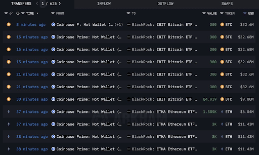 Arkham ujawnił, że BlackRock najpierw kupił 9000 ETH, a kilka minut później kolejne 1585 jednostek. Następnie nabył 84,9 BTC, a następnie kolejne 2100 BTC, które rozłożył na siedem różnych transakcji po 300 BTC każda.