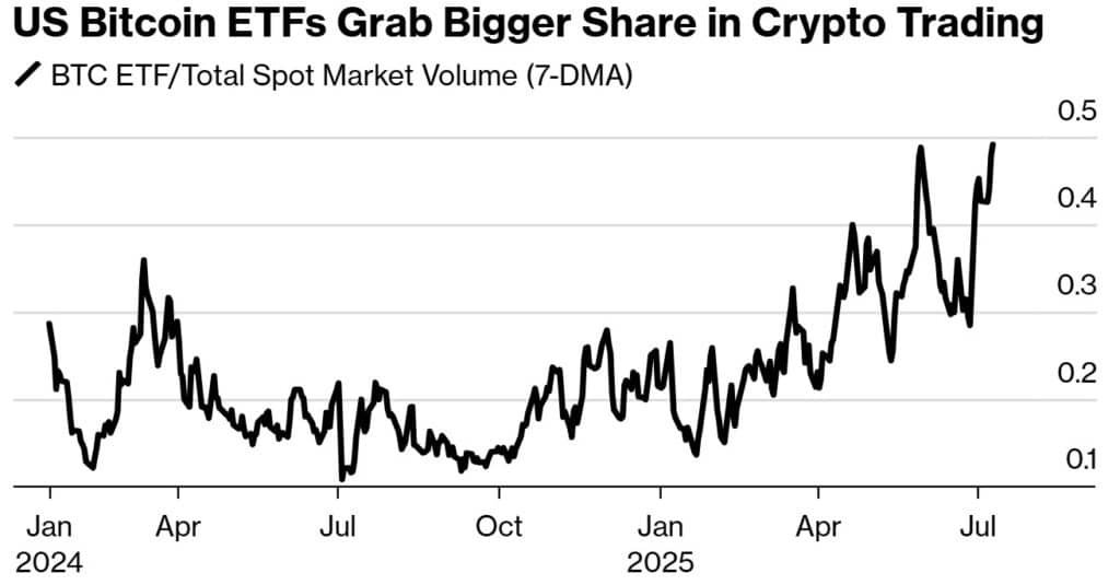 Prawie połowa globalnego handlu spot BTC przechodzi przez dwanaście amerykańskich ETF-ów. W tym kontekście IBIT nie tylko lideruje pod względem aktywów, ale też kreuje rynek pochodnych. To on dyktuje tempo i ton — jak dawniej robił to Deribit czy Binance Futures.