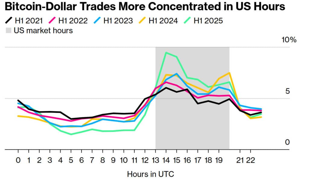Jeszcze niedawno najwięcej transakcji na parze BTC/USD miało miejsce w azjatyckich godzinach nocnych. Dziś? Ponad 57% całkowitego wolumenu przypada na godziny amerykańskiego rynku. To znaczy jedno: centrum grawitacji Bitcoina przesuwa się na Zachód, dosłownie i w przenośni.